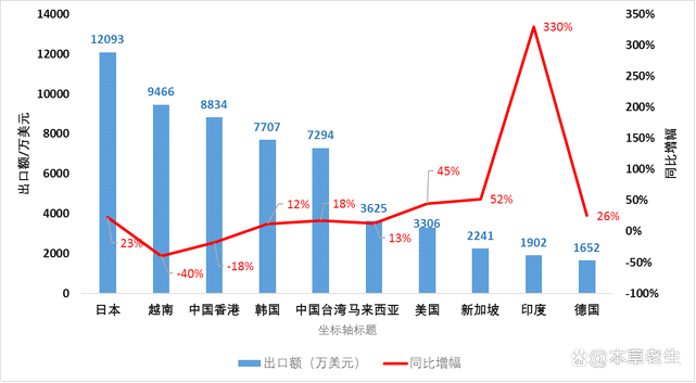 2022年上半年,中药材及饮片出口前十大市场(简称TOP10市场)是日本、越南、中国香港、韩国、中国台湾、马来西亚、美国、新加坡、印度和德国。对TOP10市场出口额占出口总额的80%。TOP10市场中,只有对越南和中国香港出口额同比大幅下跌,对其他八个市场出口额均出现大幅增长,说明上半年国际市场需求整体反弹回暖。其中,对印度出口额同比增幅高达330%,甚至比2021年全年对印度出口额高出160%,印度一跃晋级我国中药材及饮片出口TOP10市场!对印出口为啥暴增?卖个关子,后面再说。